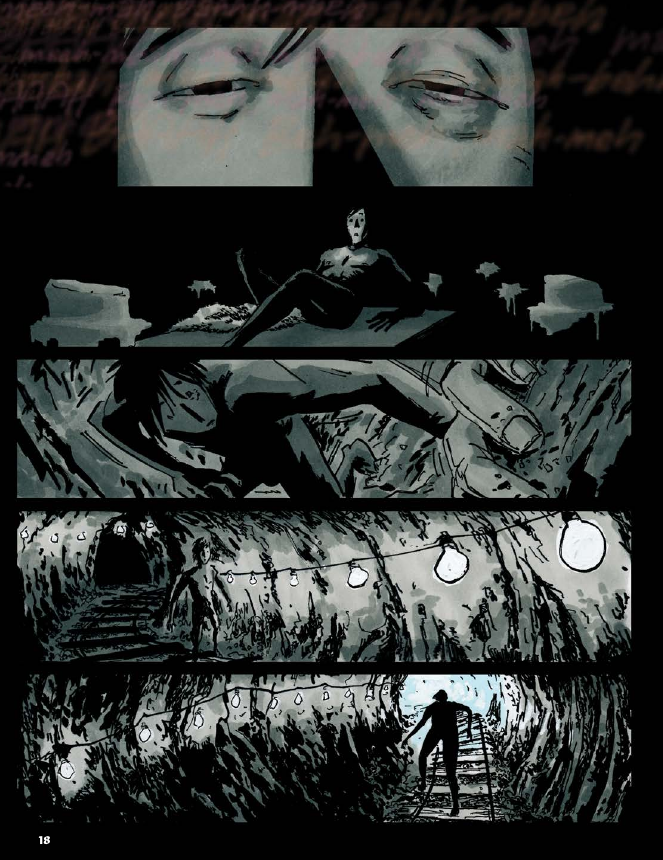 The Cloven is genre fiction of the type once published by Vertigo, making it an unexpected choice among the Fantagraphics list, the more so for some clumsy narrative choices. As Tuck stumbles around his new home, mistakes he makes might easily have been prevented with fundamental information provided sooner. Having explored one version of what could be, Stein has a reason for sending Tuck back to a big city, and he underlines polarised opinions about genetic tinkering via a unsubtle radio show exposition dump. It cements Stein as not the best judge of how long a scene should take nor of when to supply relevant information. A journalist’s conversation is scattered throughout, returned to near the end in order to preface the ending when most readers will have forgotten it was taking place.