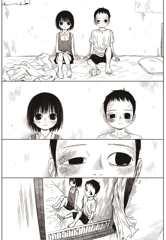JH continues to draw the children as innocents despite their innocence being eroded, their wide eyes now reflecting that more than previously. Don’t be fooled by the brightness of the cover, as the stark contrast of the black and white art within can be considered as a metaphor for their choices, and that art continues to be bleak, strange and expressive.