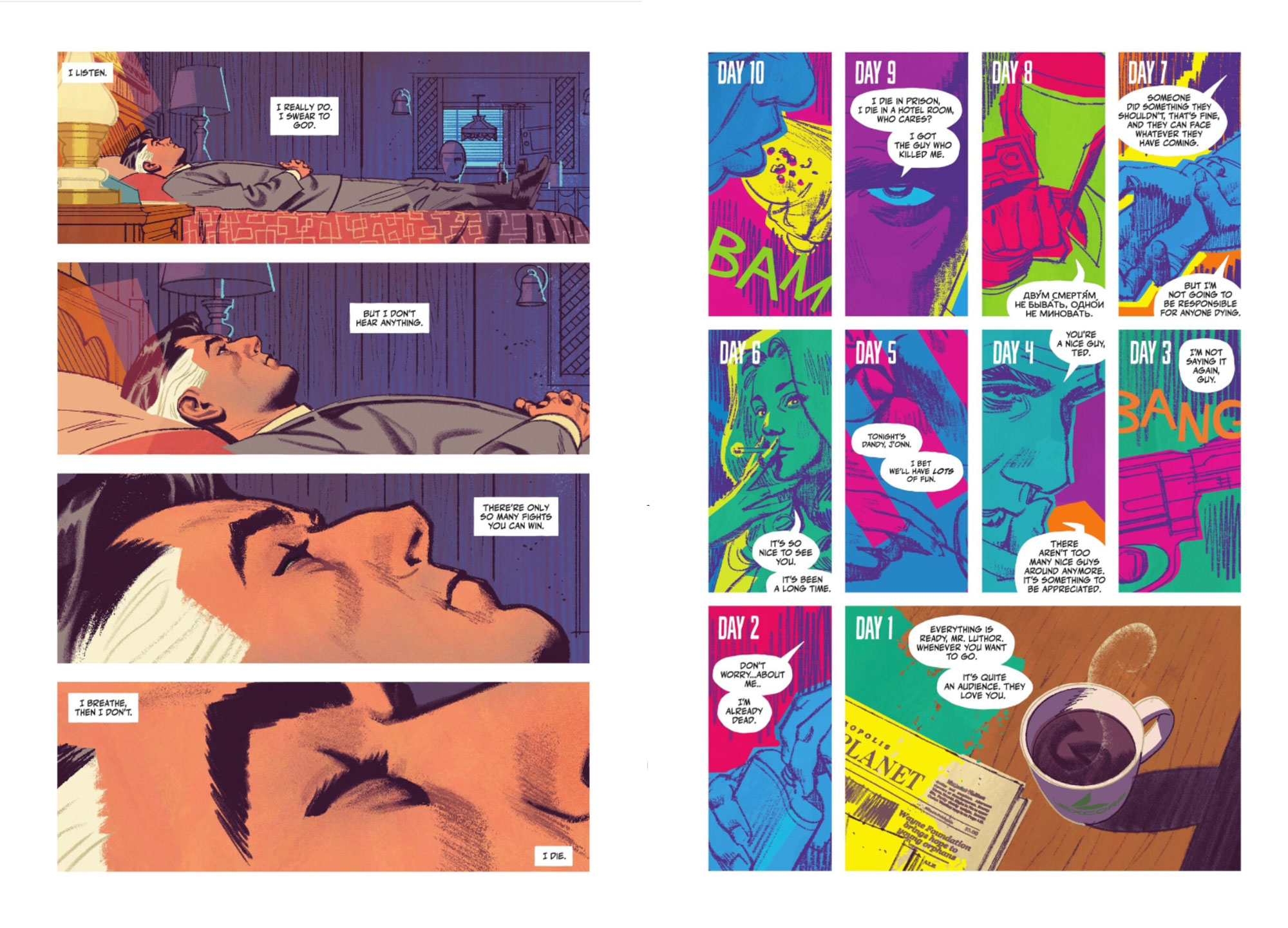 Tom King’s riff on the 1949 classic Film Noir whodunnit D.O.A. delivers an ingenious puzzle that shuffles the pieces back and forth between scenes of past and present. Chance’s backstory is interwoven with the stories of the people he questions in his attempt to find out who is responsible for his impending death, and Greg Smallwood’s beautifully retro-flavoured design and illustration techniques deliver stylish and intricate compositions that are strong on character and interpersonal relationships. Every chapter examines a different member of the JLI, designed with a unique twist illuminating their particular power and personality. The inventive ways their quirks and styles are explored are brilliantly playful and intriguing. And like the best Noir films, the mixture of greed, pride, human fallibility, doomed romance and surreal plot devices adds up to well-realised misdirection as the mystery only deepens the longer the story goes on. But with each day Chance gets weaker and less capable as his body begins to fail. Is he going to die before he uncovers the identity of his killer?