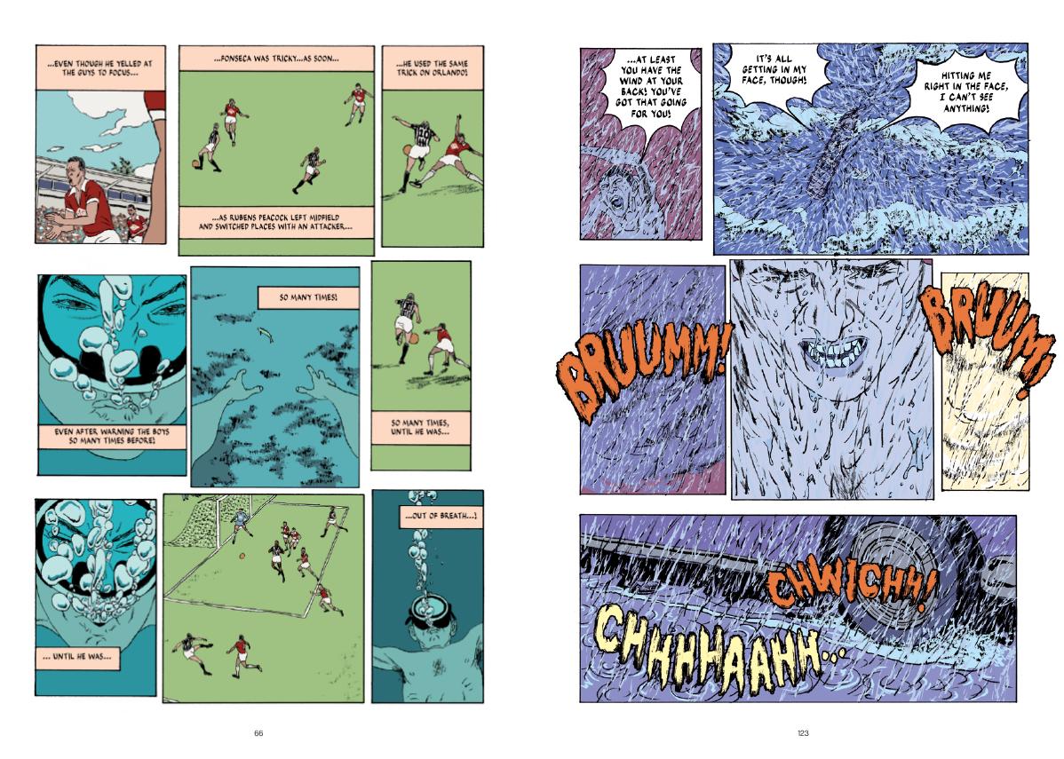 Hélcio gradually evolves into the featured character, Quintanilha extrapolating what life is like for a football player in the 1950s at various levels of the game. Hélcio is immensely talented, yet prefers scoring goals to remaining in the team position he’s allocated, and doesn’t understand why he’s lectured for playing out of position when he scores more often than not. This is contrasted with the tranquillity he feels when putting on a scuba mask and exploring the clear waters. “It wasn’t like he was entering the water”, explains a never revealed narrator, “but like he was exiting the world”.