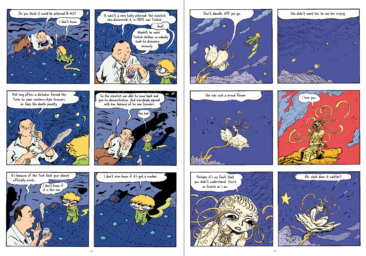 Adapter Joann Sfar has de Saint-Exupéry’s own relatively crude drawing illustrating his novel as a guide, but opts for using his own style rather than modifying it to match the book illustrations, and it’s not entirely successful. Rather than enhancing the free-flowing imagination of the original story, Sfar constricts it into an unvaried grid of six panels per page. It works in accommodating almost all the the original text, but items of wonder such as the vain flower suffer from the restriction when larger illustrations might have expanded the allure. What it does bring out is the sense of scale. Although small on Earth, hence the title, it’s almost always the case that the Little Prince is large when visiting other planets.