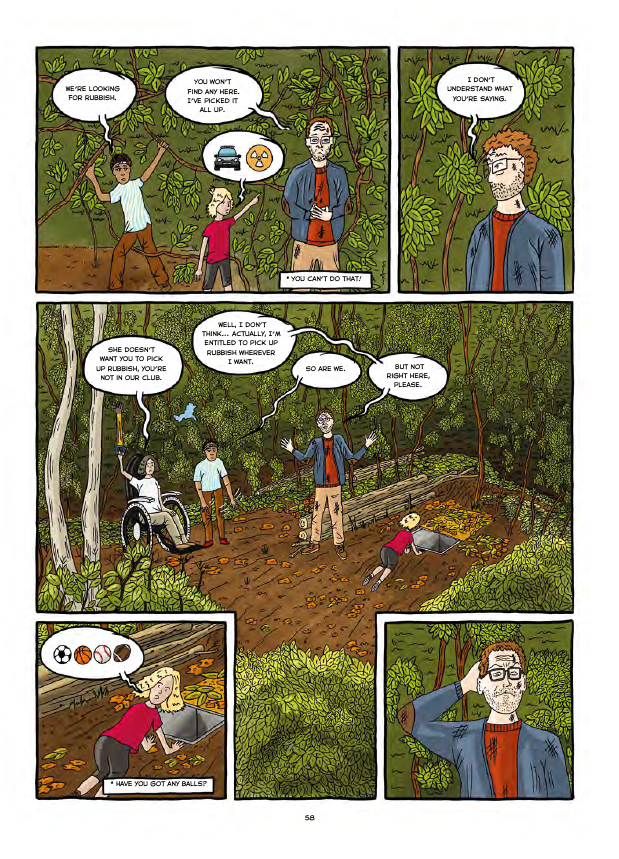 The Most Amazing Saturday Morning Rubbish Club is a graphic novel designed to highlight children whose conditions restrict their lives and at the same time provide positive role models. Arthur is on the autistic spectrum, Finn has cerebral palsy confining him to a wheelchair and lack of oxygen in Uma’s brain when a baby has hindered development. They’re drawn in full colour from the start, but surrounded by white people, not coloured until they achieve some kind of understanding about divergent conditions.