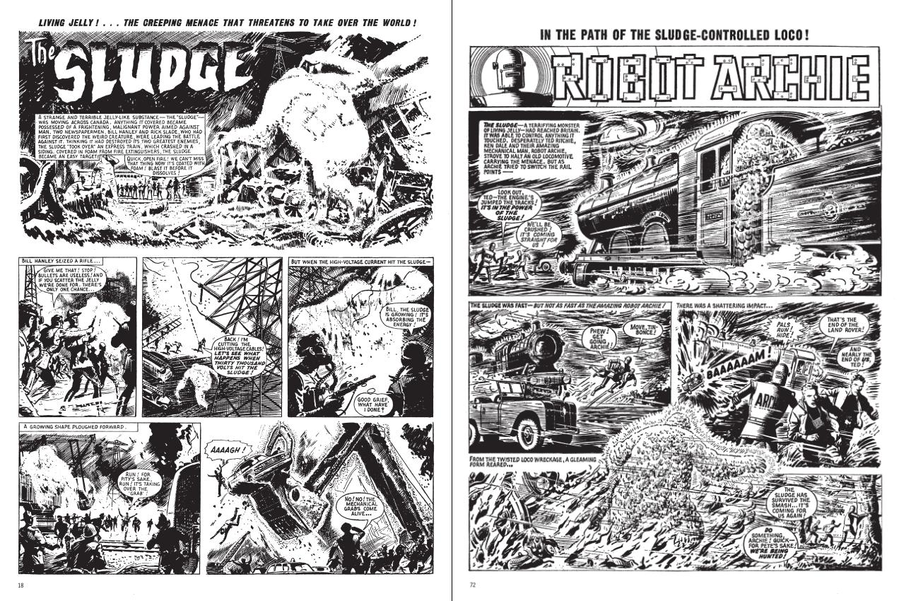 A subtitle of 60th Anniversary is unfounded optimism for a character barely seen for fifty of them, but the Sludge is a British variation on the mindless muck monsters familiar to American comics readers. Creator E. George Cowan wastes all of three panels explaining how atomic bomb residue from tests at sea combines with undersea volcanic vapours to coalesce into a muddy human form, large enough to clamber onto a passenger liner. Don’t worry readers, it’s completely evacuated in good time with not a single person harmed. When the Sludge arrives in Montreal we learn it can induce violent rages in people who touch it.