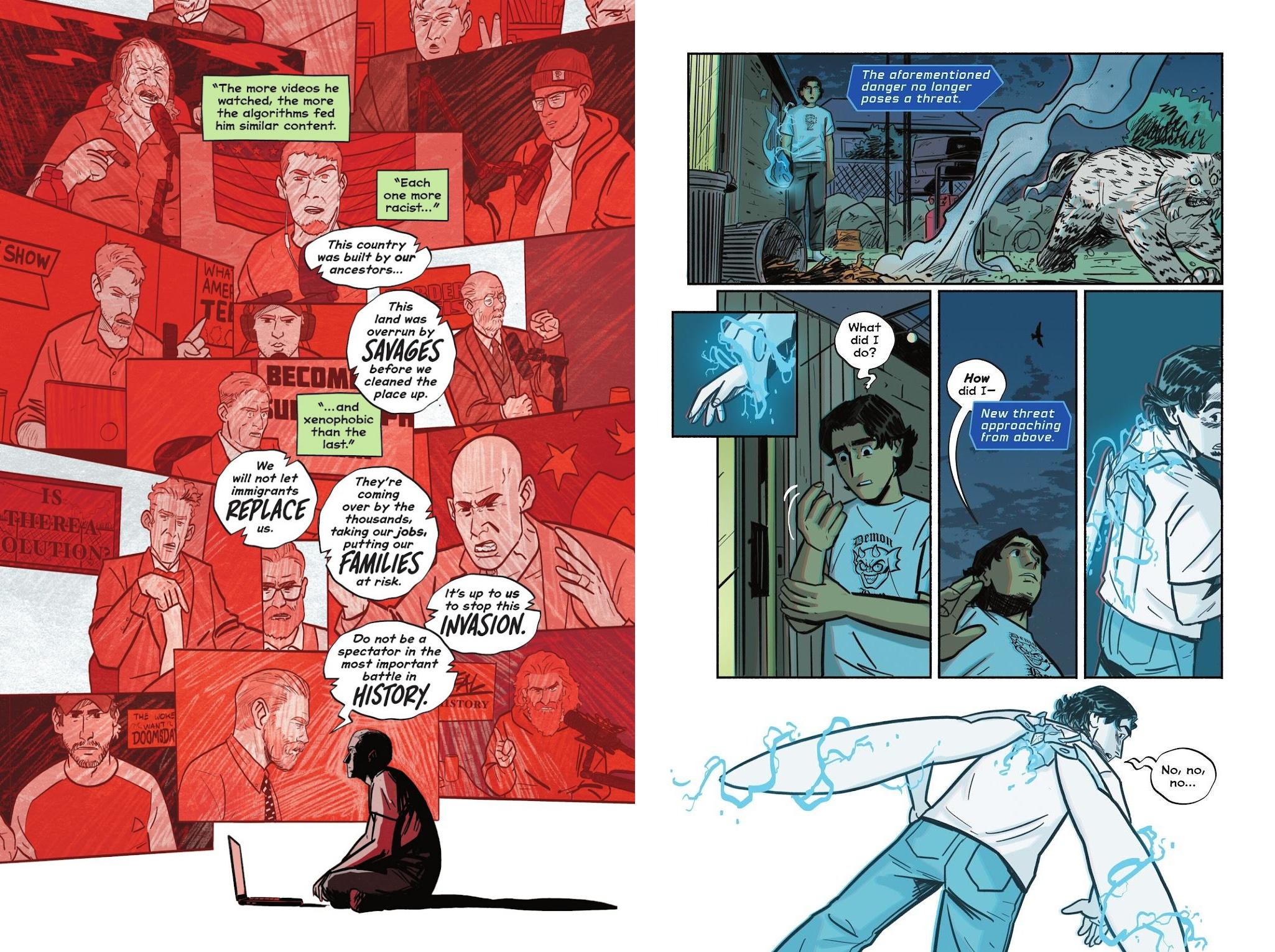 Taking its title from Woody Guthrie’s anthemic protest song, This Land is Our Land combines the origin story of the Blue Beetle with a debate about racism and immigration. Julio Anta starts in the classroom before widening the discussion, but creditably doesn’t take the most obvious route of establishing a one-dimensional wrong. The reasons for Riley’s isolation and conversion to views blaming immigrants for US problems are laid out. Meanwhile, Jaime has problems of his own as the rock affixes itself to his spine and is a communication device with an alien society. They claim to be benevolent helping planets on the verge of catastrophe, while the device can bestow Jaime with super powers.