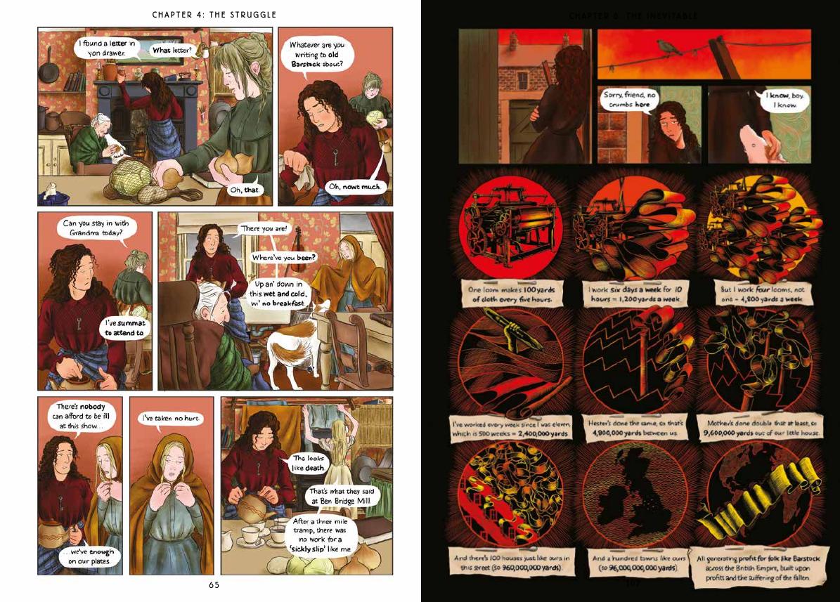 The Rickard sisters bring this to life visually with emotionally strong personalities, well defined surroundings and a real sense of purpose. Period details are scrupulously conveyed and where the story permits there’s an expansion into startlingly decorative locations and attractive countryside, although it’s made clear most haven’t the time to appreciate that. Holdsworth dissects the hypocrisies of the era, and the art shows the industrial chimneys in the background as Hester’s health declines. Overall there’s the same colourful and flat look often seen on trade banners carried in parades.