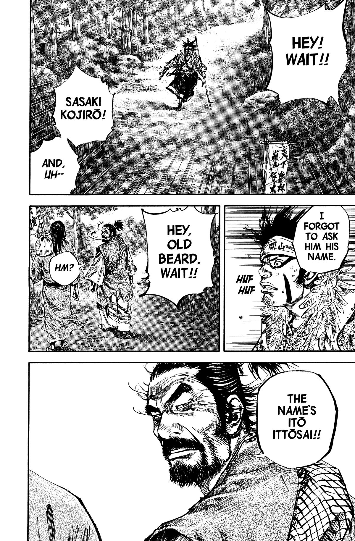 Just in case you’re keeping count, this is now Takehiko Inoue’s fifth Vagabond volume without the nominal leading character, and instead looking at the youth of Sasaki Kojirō, a master swordsman in his teens. He’s accompanying Itō Ittōsai, in his fifties, but with a formidable combat reputation.