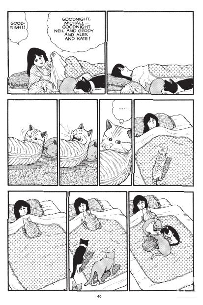 Occasionally Kobayashi will drop almost all flights of fancy and just have cats behaving as cats do, such as a pair of strips titled ‘The Cat Cries at Midnight’. There Michael and his pals prevent a woman from going to sleep as they seek the most comfortable spot for themselves.