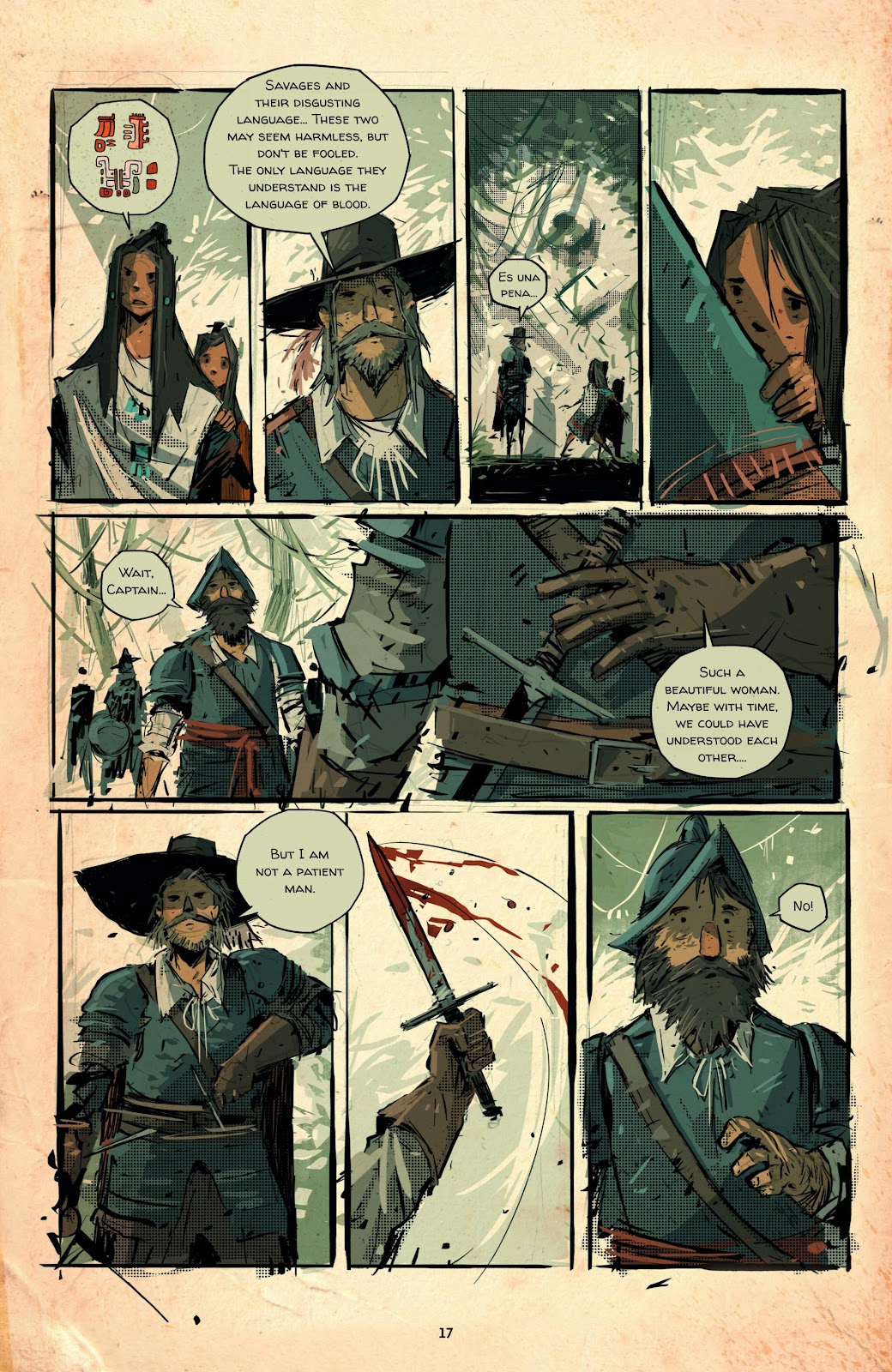 Alex Vede is best known for layered single illustrations, but it’s a talent readily transferred to comics with a pleasingly retro look, the art scratchy, escaping panel borders, on faux-parchment paper and with extensive use of random toned colour shapes. There’s a roughness to all his people and the faded colours add to the feeling of times long past, while there’s a suitable homeshod mystique about the silent supernatural creations that manifest. Not as appealing is the choice of upper case typeset lettering, although compensation when they appear are the pictograms for the indigenous people’s dialogue.